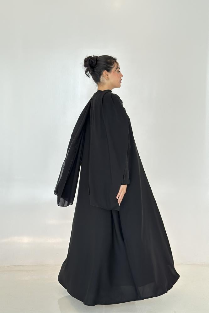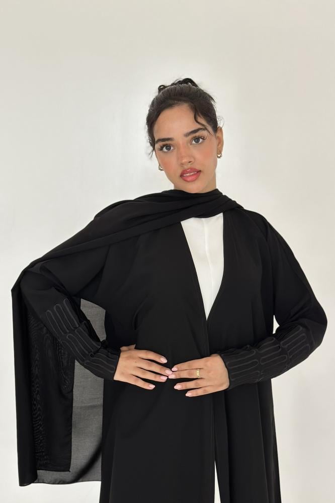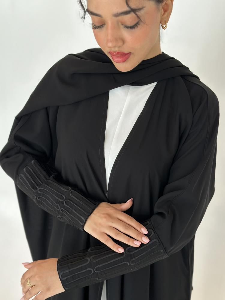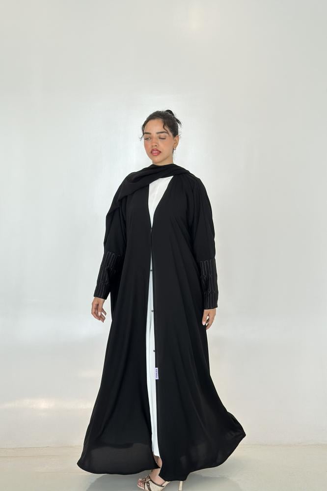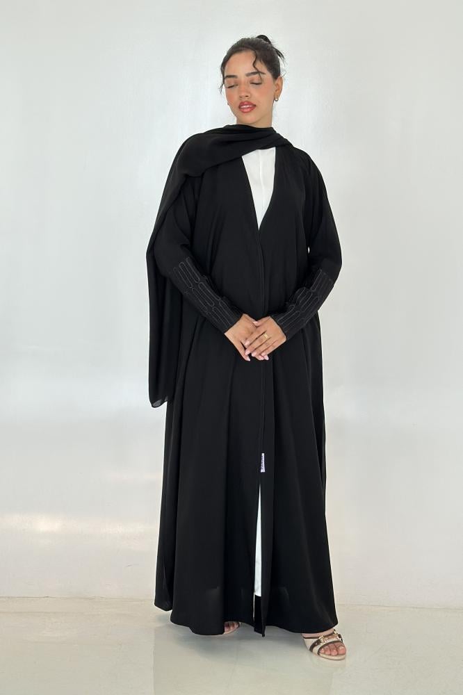 عباية كريب نص كلوش بأكمام مطرزه.